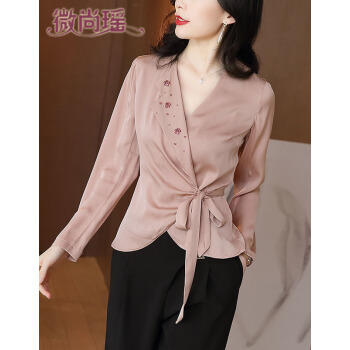 微尚瑶衬衫女2020秋季新款名媛风气质V领系带收腰钉珠上衣女时尚百搭优雅纯色长袖衬衫女7328 粉色 请拍正确尺码 |