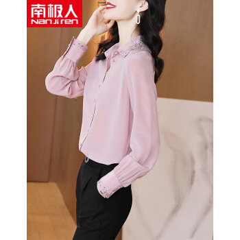南极人 衬衫女长袖2020秋季新款韩版时尚宽松女装衬衣气质翻领蕾丝勾花刺绣小衫上衣潮 粉色 M |