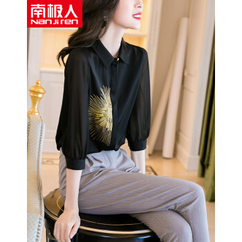 南极人 七分袖衬衫女2020夏季新款女装韩版时尚绣花宽松衬衣气质优雅POLO领上衣 N4-NRE11-9393-黑色 M |