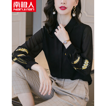 南极人 长袖衬衫女2020夏季新款时尚绣花衬衣休闲宽松女装雪纺小衫气质优雅潮流上衣潮 N4-NRA67-8608-黑色 M |
