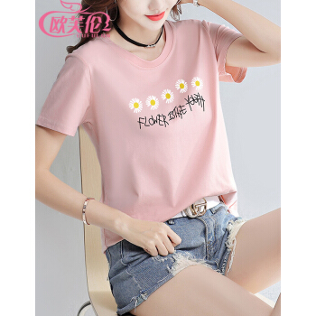 欧芙伦t恤女短袖2020新款宽松印花小雏菊简约时尚体恤上衣潮A0163 粉色 M |