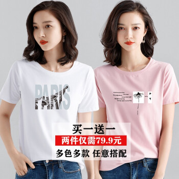 【两件装】知语者女装短袖t恤女宽松体恤大码显瘦上衣2020夏季新款百搭韩版印花时尚纯色棉质打底T恤女 9035白色+9048粉色 L《105-115斤》 |