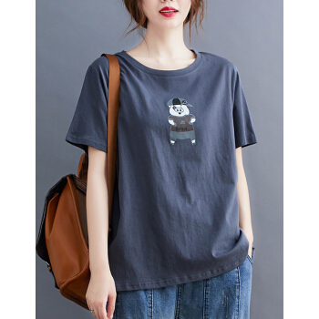 婪澈T恤女2020女装夏季新款文艺棉圆领印花短袖t恤女宽松大码休闲上衣女 深灰色 请拍正确尺码 |