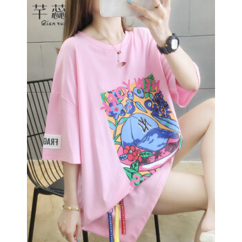 芊蕊短袖t恤女2020新款时尚韩版印花圆领中长款宽松大码女装胖MM半袖打底上衣服ins潮 粉红色 M |