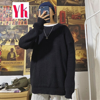 港风潮流ins慵懒风毛线衣情侣纯色圆领针织衫韩版宽松学生毛衣男 黑色 M