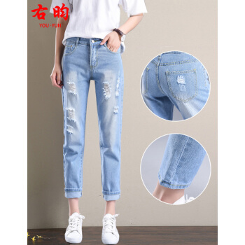 【2件特价】右昀 高腰破洞牛仔裤女宽松春秋2020新款显瘦百搭学生九分哈伦萝卜裤子 浅蓝色 28【适合100-110斤】 |