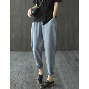 龙芝美 天丝牛仔裤女2020夏季新款复古文艺松紧腰宽松哈伦九分裤女 蓝色 请拍正确尺码 |