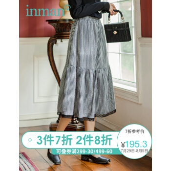 茵曼2020秋装新款松紧高腰A字中长款学院花边文艺复古格子半身裙【F1803571】 黑格 L |