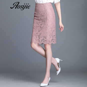 Aosijie轻奢品牌女装 高腰蕾丝包臀半身裙子2020春夏新款睫毛下摆蕾丝勾花中长款大码裙子 藕粉色 M |