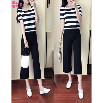 竽妤休闲裤女休闲套装女2020夏季阔腿裤套装女夏装时尚套装新款韩版休闲女夏装两件套洋气套装 黑色条纹 请拍对应尺码 |