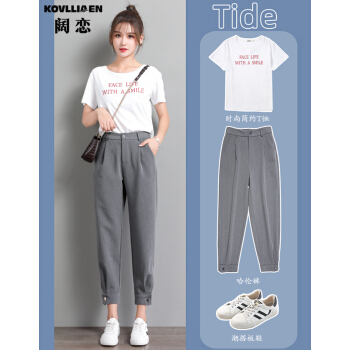 阔恋冰丝休闲裤女夏季薄款束脚西装裤2020新品直筒宽松高腰哈伦裤子百搭显瘦九分裤韩版松紧腰萝卜女裤 灰色 M |