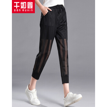 干如鑫休闲裤女运动裤女2020夏季新款时尚网纱哈伦裤子女学生显瘦七分裤宽松运动百搭高腰大码灯笼裤女潮 图片色(黑色) M(90-100斤) |