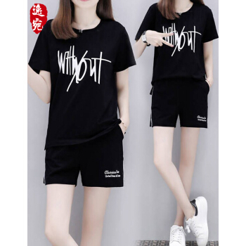 逸宛yw短裤女运动休闲套装女2020年夏装新款大码运动服时尚印花短袖短裤两件套跑步服女学生宽松套装 黑色 M【建议85-105斤】 |