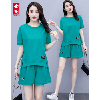 金琍JL短裤女休闲套装女2020夏季新款圆领短袖上衣短裤套装学生宽松晨练跑步大码女装减龄显瘦两件套 海蓝色 L【建议90-110斤】 |