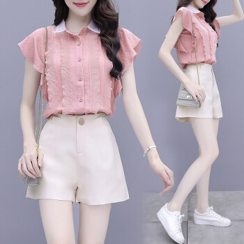 思语林 雪纺衫短裤套装女2020夏装新款小个子显高洋气减龄休闲短裤子两件套 粉色套装 S |