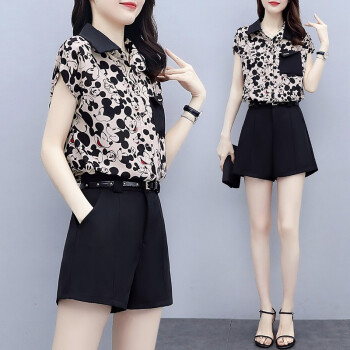 缪资 2020夏季新款韩版时尚雪纺套装女休闲气质短裤小个子洋气两件套潮 黑色套装 M |