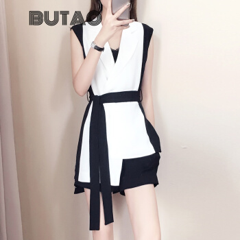 BUTAO 香港潮牌职业短裤套装女2020夏装新款女神范洋气时尚无袖小西装上衣名媛气质御姐两件套装女 白色+黑色【上衣+短裤】 M |