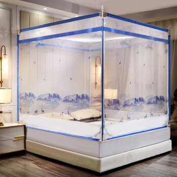 含烟家纺 防摔蚊帐1.8米三开门拉链印花蒙古包方顶1.5米床坐床双人家用蒙古包蚊帐免安装1.2米床 山水鹿-蓝 1.2*2米床使用 |