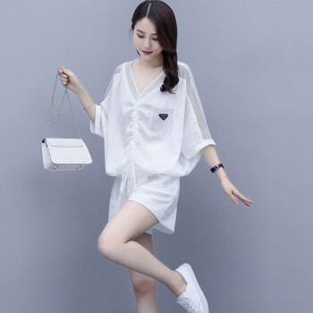 卿依瑟 卫衣短裤套装女2020夏季新款镂空拼接V领时尚卫衣上衣大码宽松时尚休闲百搭套装短裤俩件套女装 白色 M |