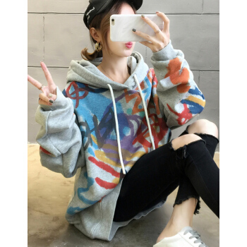 时尚欧陆 卫衣女宽松连帽中长款女士上衣潮2020春秋时尚套头韩版慵懒风印花学生款长袖嘻哈少女短外套 灰色 L |