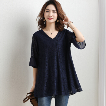 红粉宣言2020夏季新款百搭宽松收腰短袖雪纺上女圆领显瘦上衣 藏青色 2XL |