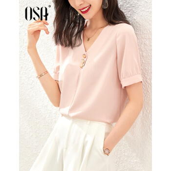 OSA欧莎气质短袖雪纺衫女遮肚子2020新款夏季欧洲站洋气小衫时尚上衣 粉色 S |