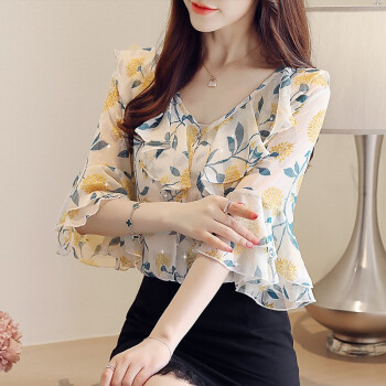 心莉美 雪纺衫女短袖2020夏季新款百搭洋气时尚女装上衣女设计感小众轻熟碎花衬衫女 白底碎花 L |