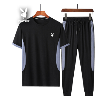 短袖t恤男纯色运动2套装棉2020棉夏季新款韩版宽松翻领潮流T恤衫大码休闲衣服男装九分裤 黑色422 XL |