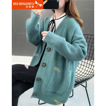 红蜻蜓 针织开衫毛衣女2020新款春秋韩版百搭宽松慵懒风外套时尚针织外搭上衣 WL738 绿蓝 均码 |