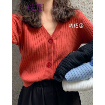 珠珊针织衫女2020新款春秋外搭毛衣小开衫外套女宽松懒慵风V领女装单排扣短款针织衫上衣 7306-砖红色 XL |