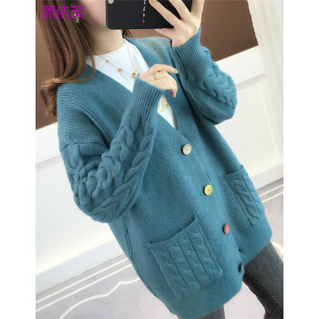 熙依芙针织衫女2020秋冬新款针织开衫女韩版宽松洋气外搭口袋麻花慵懒风毛衣外套 蓝色 M 刑释毛衣 |