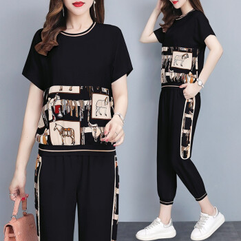 睡妍 大码女装套装女夏2020夏季新品韩版时尚套装减龄洋气宽松显瘦九分裤短袖休闲运动套装两件套女夏 黑色 L(98-110左右) |