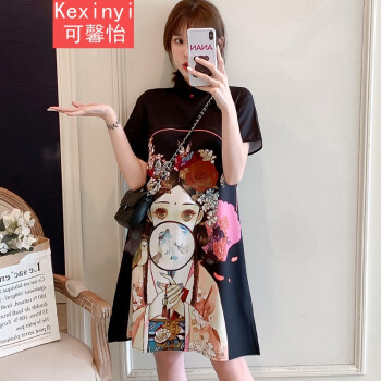 可馨怡 大码女装微胖mm连衣裙夏装旗袍改良胖妹妹加肥加大码胖人女装显瘦款遮肚肉裙子2020 黑色 XXXL(建议150-175斤左右) |