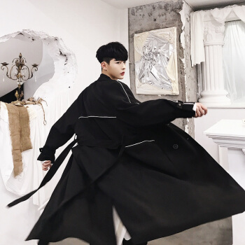 凯登狮(KEIDENLION)风衣男设计师加长款韩版男风衣宽松百搭系带外套A345-583 黑色 XL |